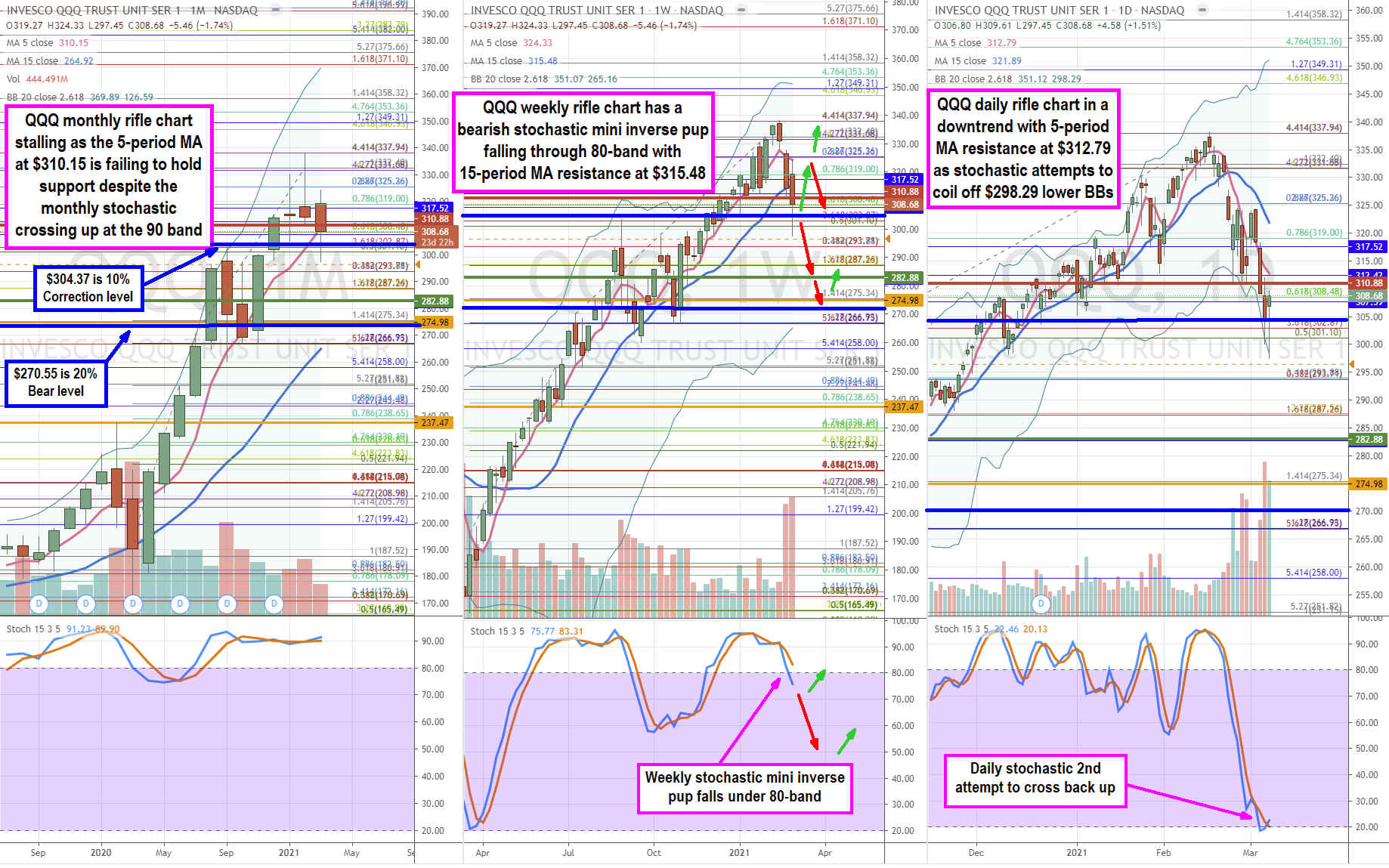 Using the rifle charts on monthly, weekly and daily time frames, we lay out the full near-term to longer-term playing field for the QQQ. The monthly rifle chart has been uptrending since surpassing its pre-COVID-19 highs in June 2020. The monthly uptrend has stalled out as the 5-period moving average (MA) flattens out at $310.55. The February shoot star candlestick sets the tone as March lows set the market structure high (MSH) sell trigger in April. So far, the low trigger has $297.45. The weekly rifle chart peaked out at the $337.94 Fibonacci (fib) level. The weekly 5-period MA is sloping down at $324.33 as the QQQ collapsed quickly through the weekly 15-period MA at $315.48 and has yet to retest that level. The weekly market structure high (MSH) sell triggered under the $310.88. The most dangerous component is the weekly stochastic mini inverse pup fell through the 80-band. The (-10%) correction level at $304.37 was tested and needs to hold support as a failure there can eventually set-up a move towards the (-20%) bear market level at $270.55 in the coming weeks. The daily rifle chart has been in a downtrend with a falling 5-period MA resistance at $312.79 and 15-period MA at $321.89. The daily stochastic is attempting to coil off the 20-band but needs to recover through the daily 5-period MA and 15-period MA to gain traction. The weekly 5-period MA at $324.33 seems daunting but needs to break back up through in order to offset the potential for a weekly breakdown. The near-term trajectory for the QQQ would be a rebound attempt back towards the weekly 15-period MA at $315.48 and 5-period MA at $324.33. The bull case could call for a move towards the daily and weekly upper BBs near $350 upside. If they reject, then a deeper sell-off first towards the $270.55 bear market level and then towards the weekly lower BBs at the $265.15 is the downside trajectory.