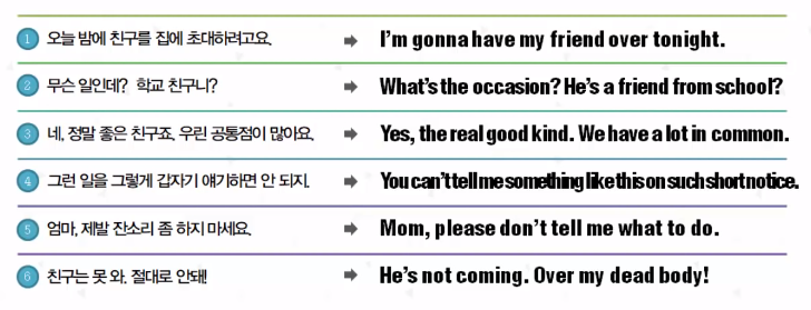 친구는 못 와. 절대로 안돼! He's not coming. Over my dead body!