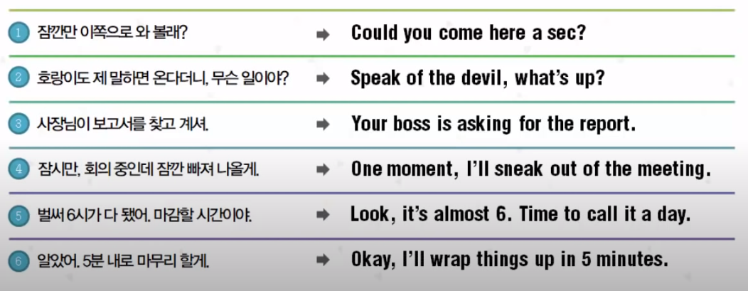 벌써 6시가 다 됐어. 마감할 시간이야. Look, it's almost 6. Time to call it a day.