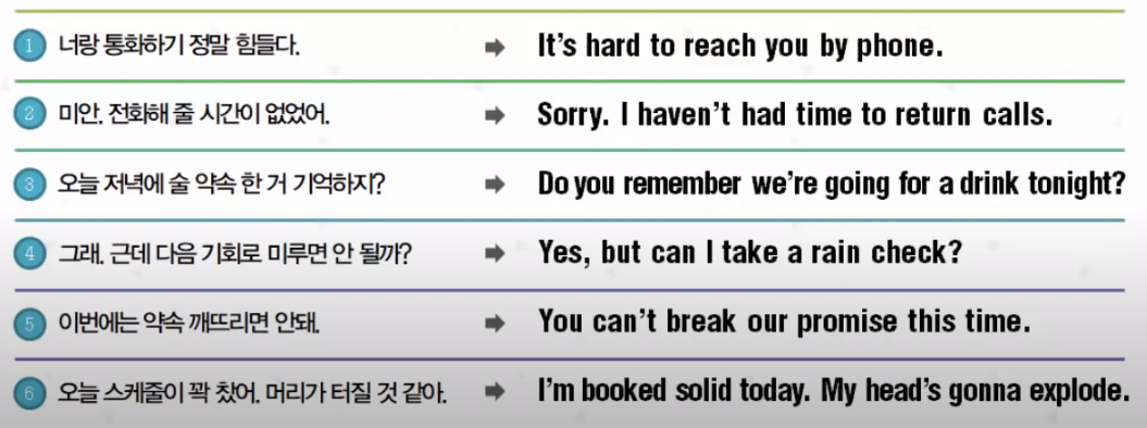 미안. 전화해 줄 시간이 없었어. Sorry. I haven't had time to return calls.