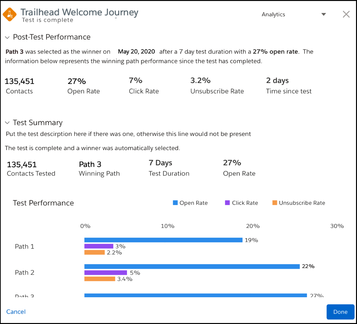 - Choose a winning path either automatically—based on engagement metrics—or manually.