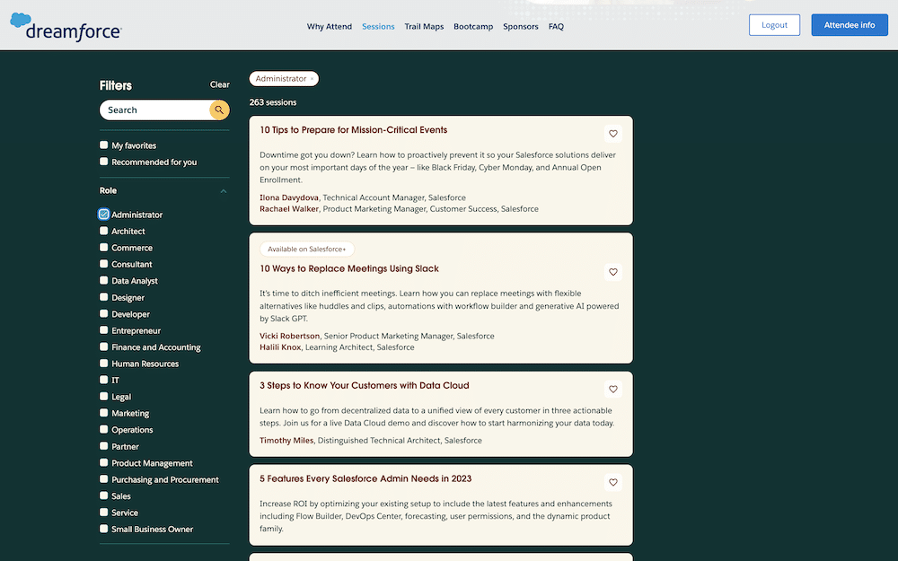 To find these sessions in the Dreamforce session catalog, select Role in the left navigation and check the box for Administrator to see all sessions tagged for admins.
