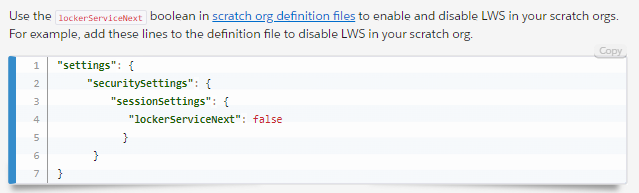 스크래치 조직 정의 파일lockerServiceNext 에서 부울을 사용하여 스크래치 조직에서 LWS를 활성화 및 비활성화합니다. 예를 들어 스크래치 조직에서 LWS를 비활성화하려면 정의 파일에 다음 줄을 추가합니다.