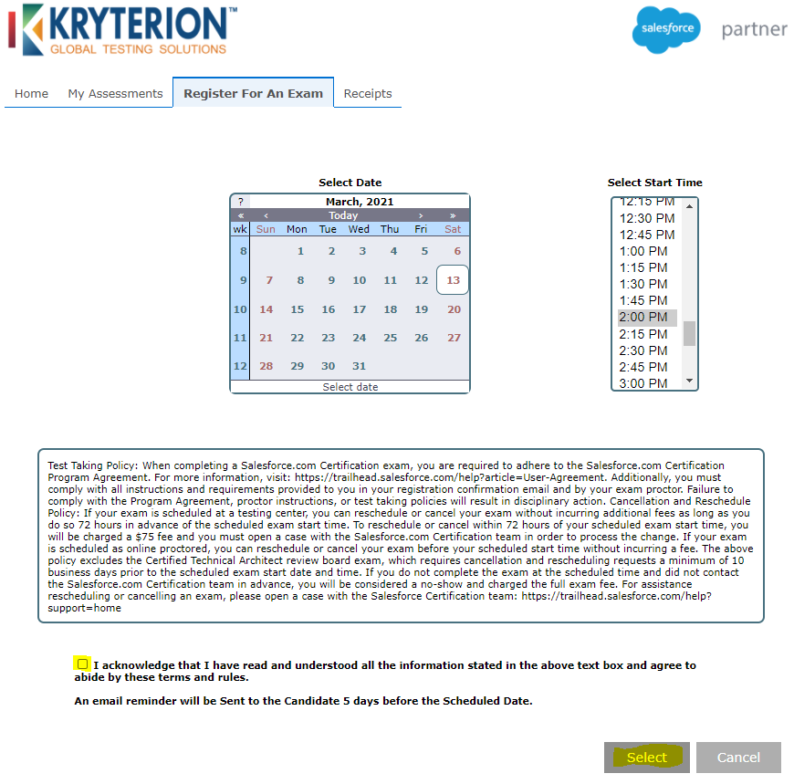 4. 시험정책을 읽었다고 체크박스에 표기 후에 Select 버튼을 클릭합니다. (시험일시를 변경하는 경우 72시간 이후 변경은 무료 이지만 시험일이 72시간 이내일 경우에는 날짜변경료로 75$가 청구되므로 시험날짜 선택할 때 주의해 주세요.)
